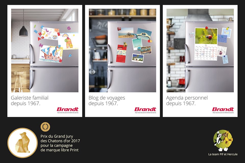 Projet réalisé avec Vincent Beigbeder (https://www.linkedin.com/in/vincent-beigbeder-3205b220/) autour de la marque Brandt. Nous avons choisi de valoriser le frigo en tant qu’assistant de la vie quotidienne sur lequel on dépose des listes de courses, cartes postales, des faire parts de naissance, mariage, des mots d’amour, les dessins des enfants… Un membre de la famille à part entière, notre “vitrine de notre quotidien”.