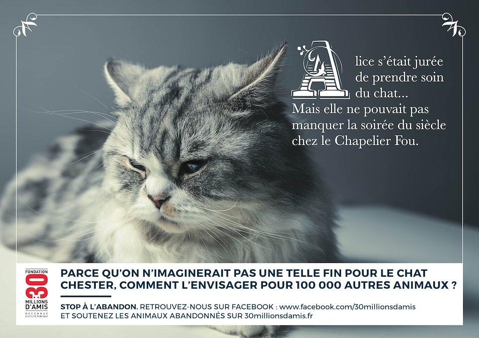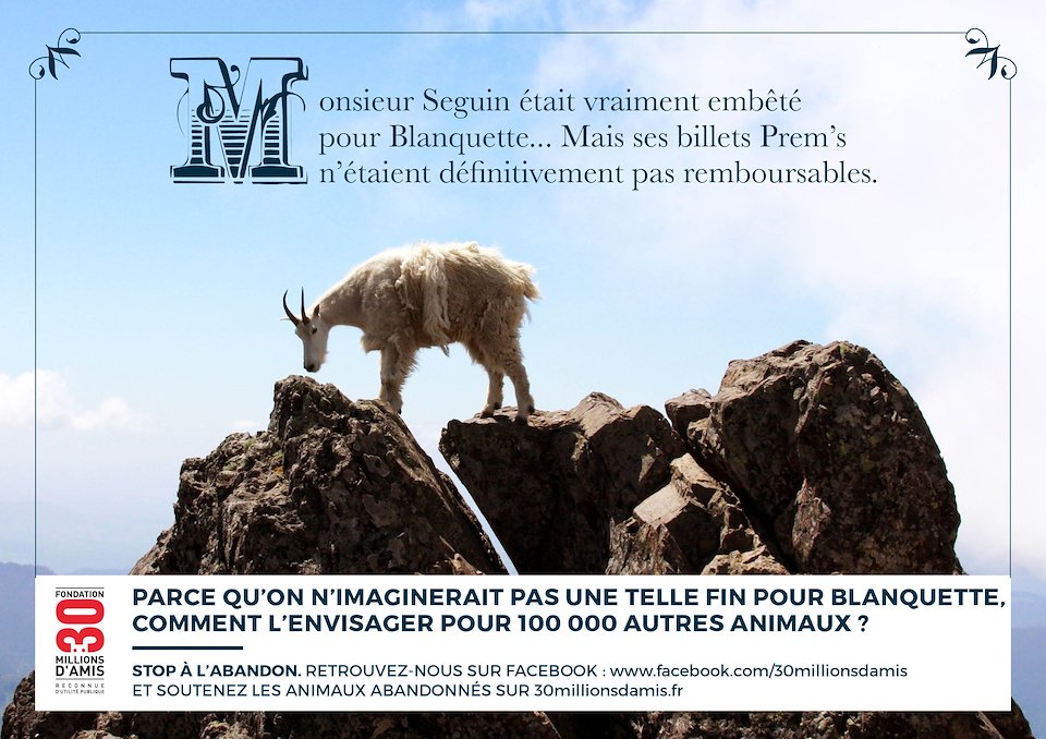 Campagne proposée dans le cadre " Grandes causes et environnement » du concours des chatons d’Or 2017. On interpelle le public sur l’abandon massif d’animaux de compagnie à chaque départ de grandes vacances en France : cet aspect surréaliste et peu romantique de renoncer un compagnon de toujours pour quelques jours de liberté personnelle. On met en avant une attitude égoiste à travers des célébrités de la littérature : parce qu’on n’imaginerait pas une telle fin pour Lassie / Chester / Blanquette / Croc-Blanc, comment l’imaginer pour 100 000 autres animaux?