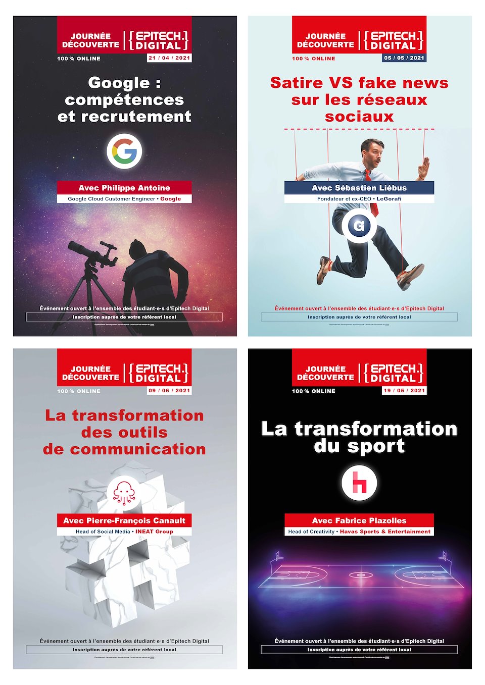 Séries d'affiches pour Epitech Digital qui organise tout au long de l'année des journées découvertes , cette année 100% online, autour de sujets d'actualité animés par des professionnels du digital.