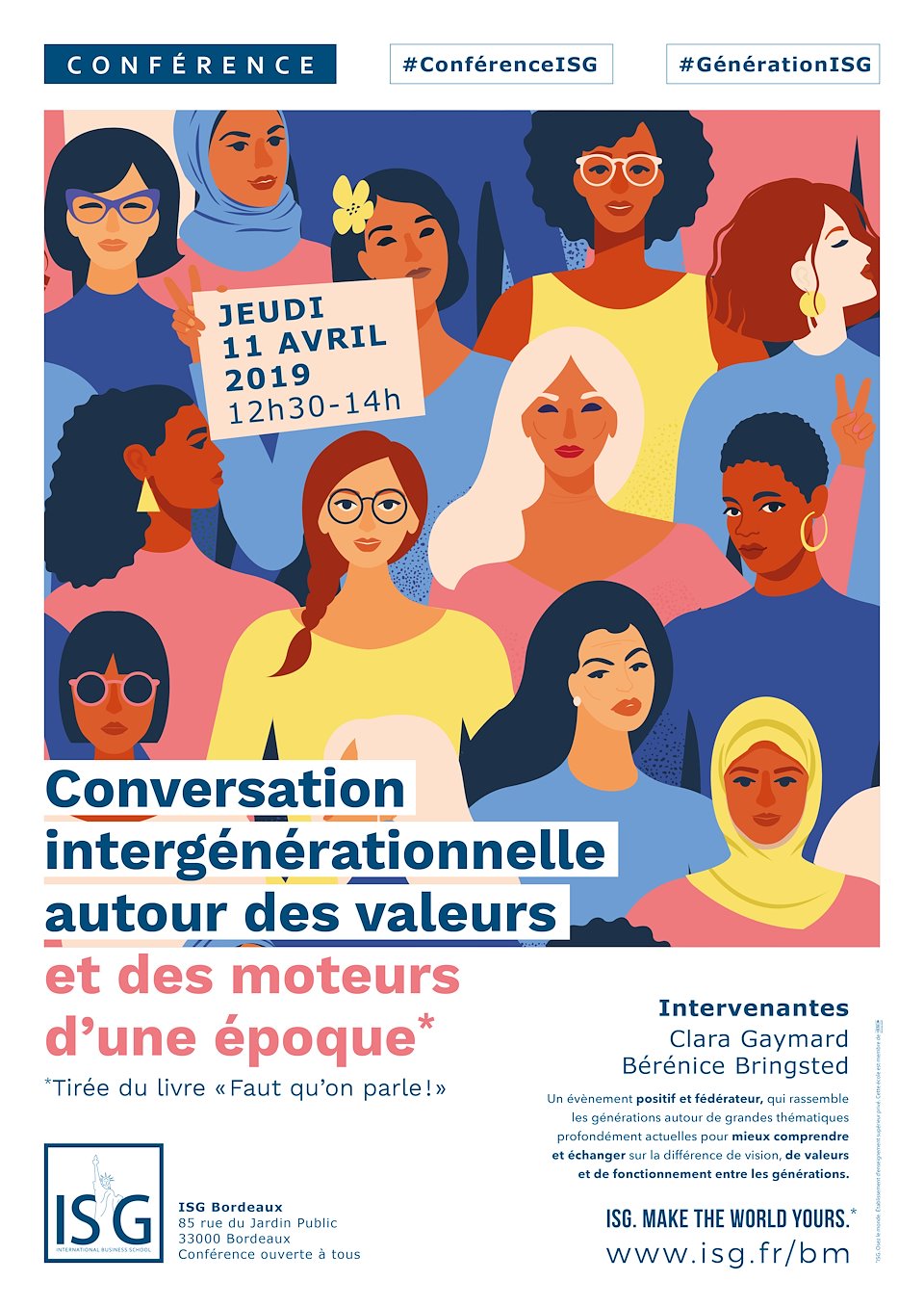 Conférence ouverte à tous à l'ISG Campus de Bordeaux autour du livre "Faut qu'on parle" : un dialogue entre une mère, enfant de la génération mai-68 et sa fille, de la génération Y, sur le féminisme, la mondialisation, le couple, l'éducation, la violence...