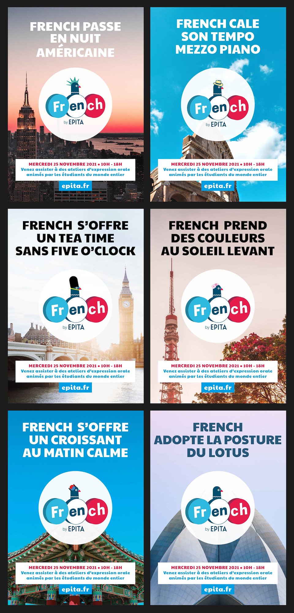 Création de logo, identité visuelle et campagne pour le centre d'études "FLE" (Français Langues étrangères) destiné principalement aux étudiants étrangers venant étudier à Epita Paris. Cette campagne détourne le logo "French" by Epita pour mettre chaque pays à l'honneur lors de conférences et journées dédiées à ces derniers.